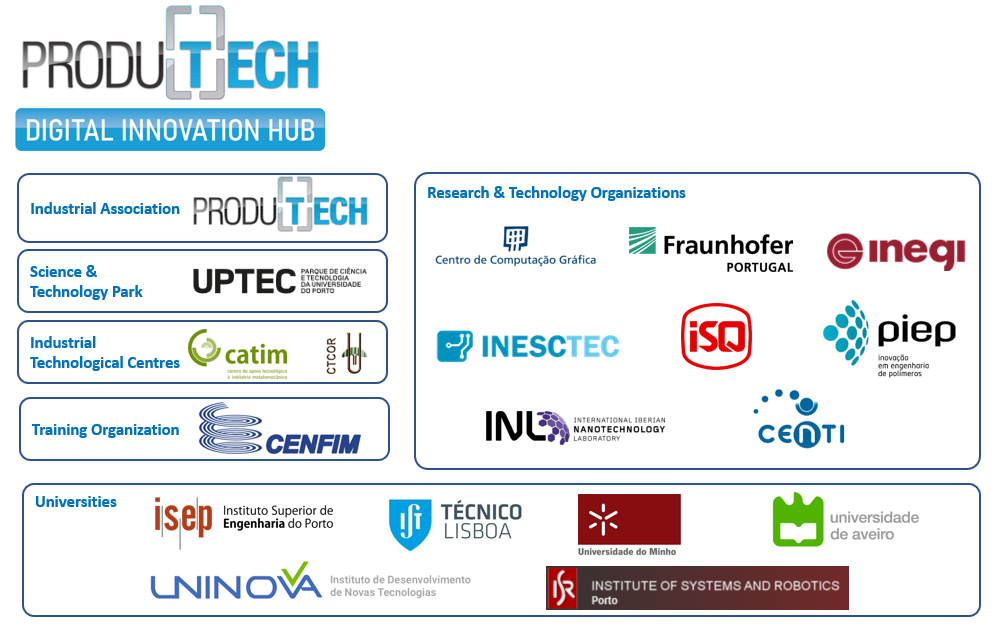 Constituído por um conjunto de 19 organizações, o PRODUTECH DIH integra uma massa crítica de capacidades, competências e serviços complementares, e implementa e explora, de forma concertada, um conjunto de atividades, infraestruturas e recursos, para a provisão de serviços de suporte à digitalização da indústria transformadora.
