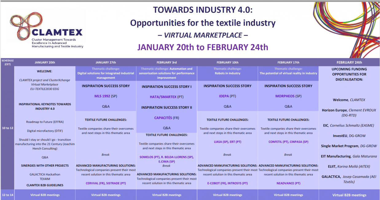 A parceria CLAMTEX, está a organizar um workshop/mercado virtual interativo para promover a adopção da Indústria 4.0 no sector têxtil. O evento decorre em várias sessões altamente interativas, com sessões plenárias e reuniões virtuais B2B entre os participantes.
