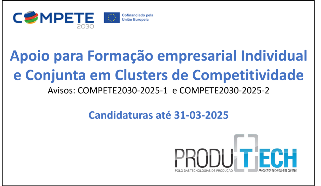 Foi publicado recentemente o Aviso COMPETE2030-2025-1 do Portugal 2030 com a designação SIQRH - Formação empresarial individual clusters que consiste no apoio para Formação de ativos – empresários, gestores e trabalhadores – das empresas inseridas em Clusters de Competitividade, nos quais se insere o Cluster PRODUTECH, estando por isso especialmente concebido para empresas diretamente relacionadas com o Cluster das Tecnologias de Produção ou com atividade relevante a montante ou a jusante.