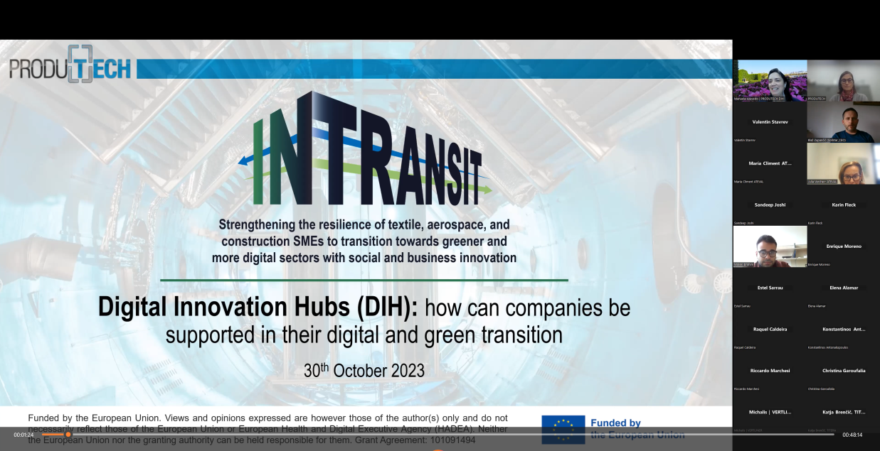 O projeto IN TRANSIT visa reforçar a resiliência das PMEs dos setores têxtil, aeroespacial e da construção civil suportando-as na transição verde e digital. Para clarificar as empresas sobre as oportunidades que os Digital Innovation Hubs têm para as empresas, organizou no passado dia 30 de outubro o Webinar “Digital Innovation Hubs (DIH): how can companies be supported in their digital and green transition”.