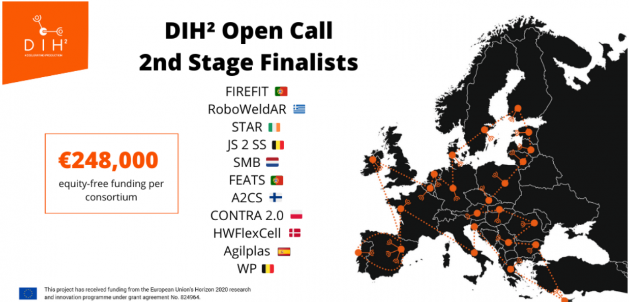 O projeto DIH² – Pan-European Network of Robotics DIHs for Agile production, realizou no final de abril o Jury day, para selecionar os finalistas da 1ª Open Call. Portugal esteve representado por 3 projetos inovadores na área da robótica industrial. Foram selecionados 11 projetos de 9 países, que irão receber até 248 000€ para a implementação/exploração de cada experimento. Dos 11 finalistas 2 projetos são Portugueses, o FIREFIT e o FEATS, que irão em breve iniciar a implementação e testes das novas tecnologias propostas.