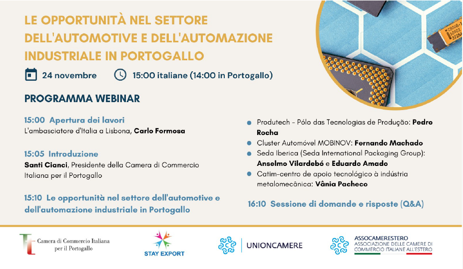 O seminário “Automazione Industriale e Industria 4.0: Le opportunità nel Settore Dell’Automotive e Dell’Automazione Industriale in Portogallo” organizado pela Câmara de Comércio Luso – Italiana, em colaboração com a Unioncamere, no âmbito do projeto Stay Export.
