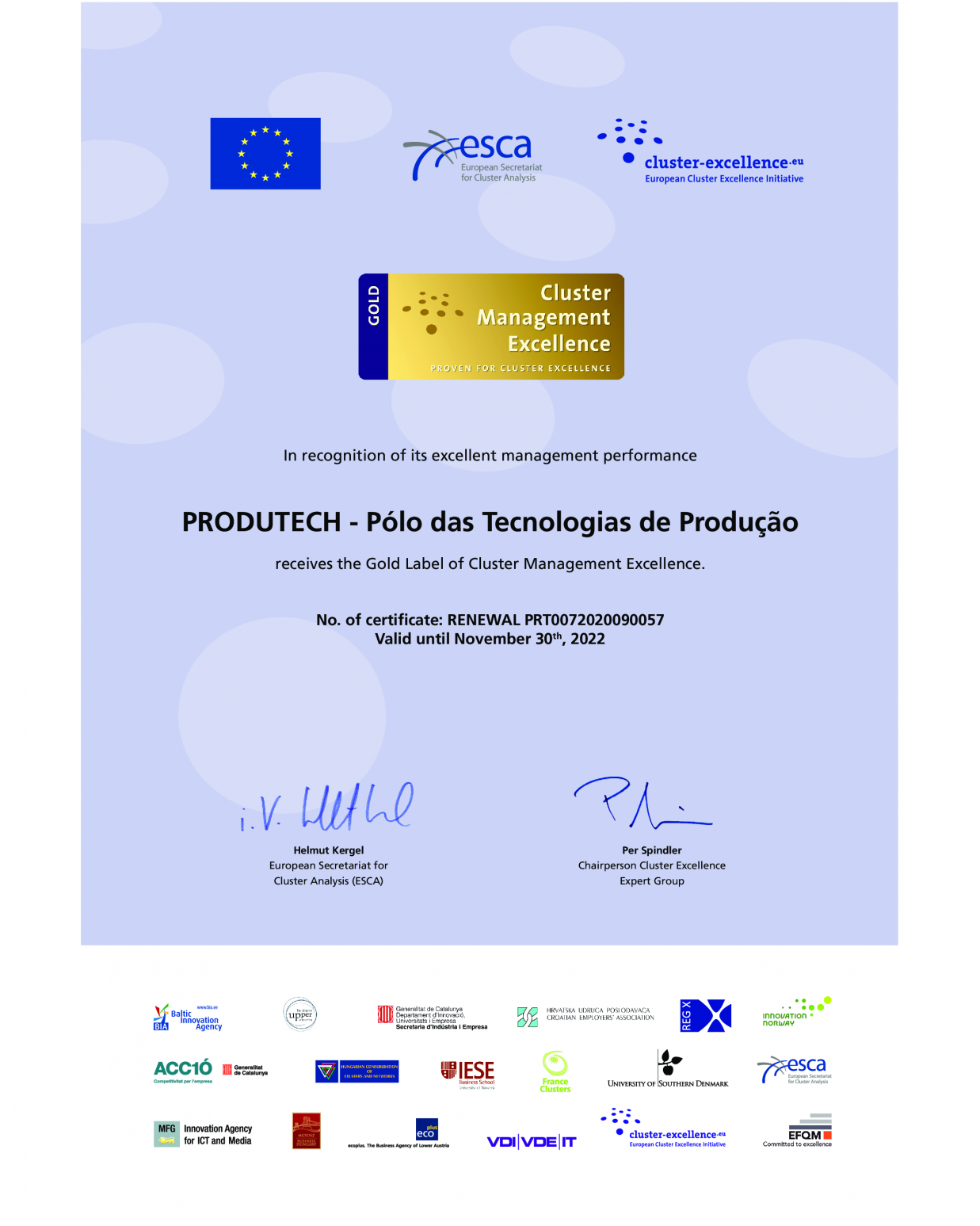 O ESCA - The European Secretariat for Cluster Analysis tem implementado um sistema de classificação e certificação com 3 níveis: Bronze, Silver e Gold Label. O “Gold label” representa o mais elevado e exigente de todos os níveis.