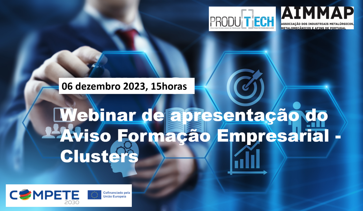 Dado o interesse no concurso para Financiamento de Projetos de Formação para Médias e Grandes Empresas, recentemente publicado, a PRODUTECH - Cluster das Tecnologias de Produção e a AIMMAP - Associação dos Industriais Metalúrgicos, Metalomecânicos e Afins de Portugal irão promover no próximo dia 06 de dezembro pelas 15h um Webinar de apresentação e explicação das várias vertentes deste concurso.